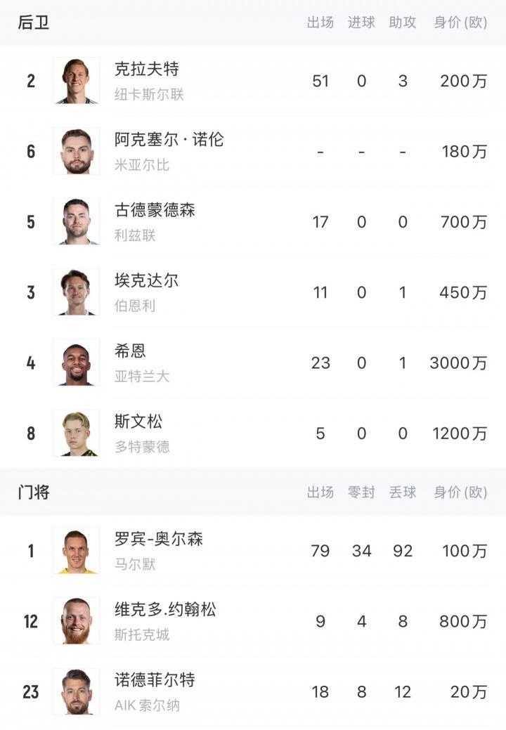 瑞典全队身价高达4.45亿欧,位列世界第10,阵中有身价1.2亿欧的伊萨克(利物浦)、7500万欧的约克雷斯(阿森纳)、4200万欧的伊兰加(纽卡)、4000万欧的雨果-拉尔森(法兰克福)、3800万欧的贝里瓦尔(热刺)和3000万欧的希恩(亚特兰大)。