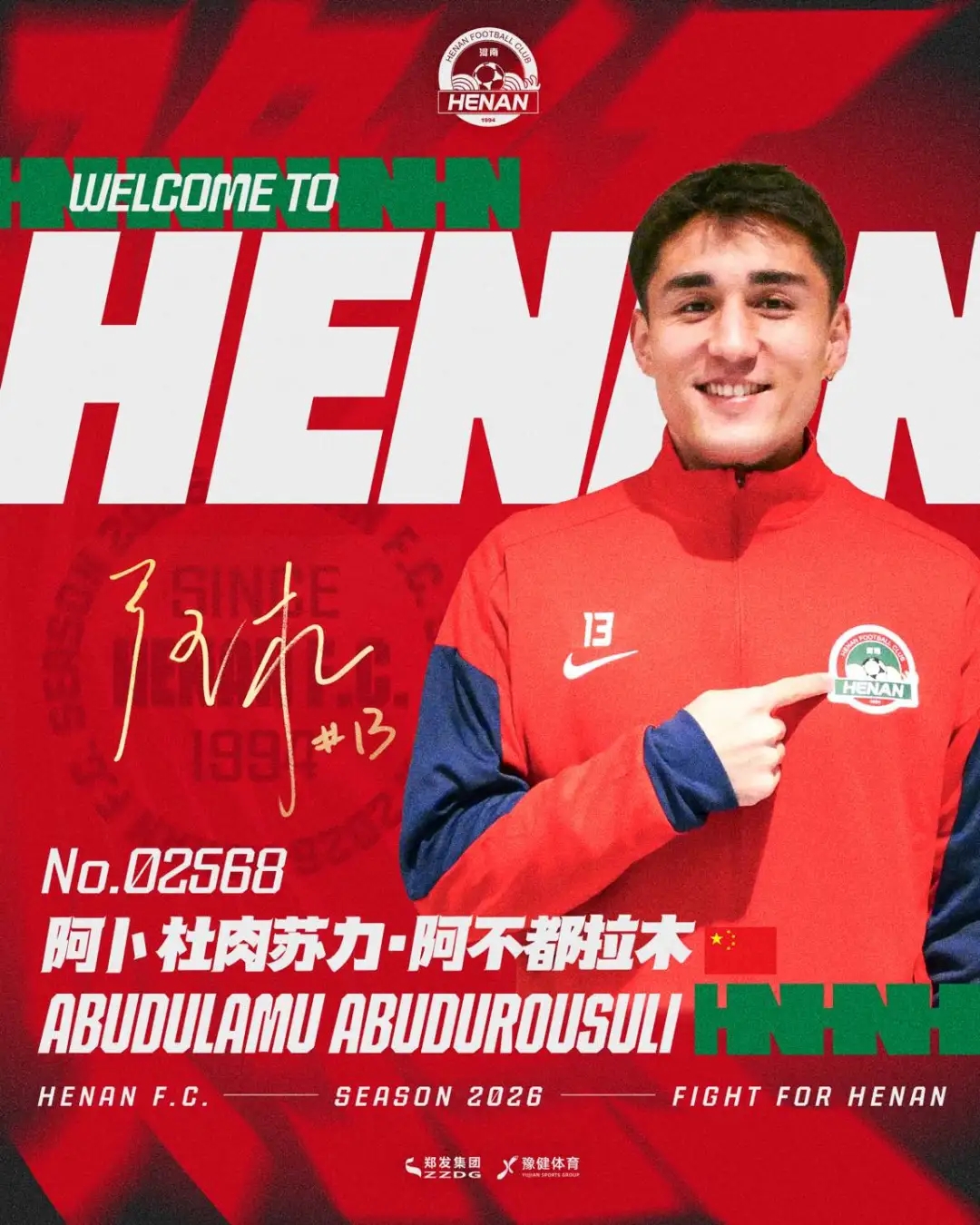 欢迎阿卜杜肉苏力正式加盟河南足球俱乐部,期待你与全体将士并肩作战,继续为河南足球拼下更多荣耀!
